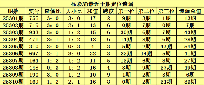 开奖回顾:福彩3D第2025310期奖号:169,百位号码遗漏0期、十位号码遗漏2期、个位号码遗漏31期,遗漏总值为33期。
