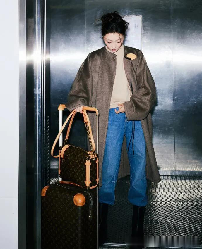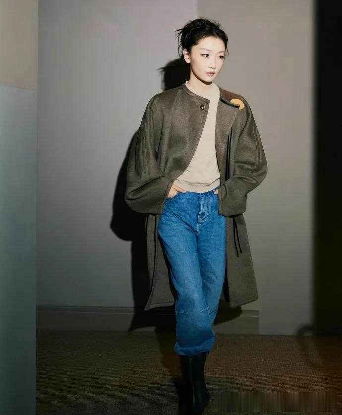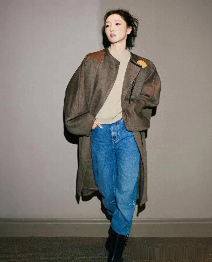 周冬雨换风格后气质大变! 穿阔版大衣+毛衣+牛仔裤, 时髦又洋气!