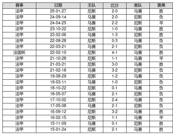 尼斯 VS 马赛两队近10年的交战次数为21场,尼斯8胜3平10负,赢球概率为38.1%,平局概率为14.3%,输球概率为47.6%。