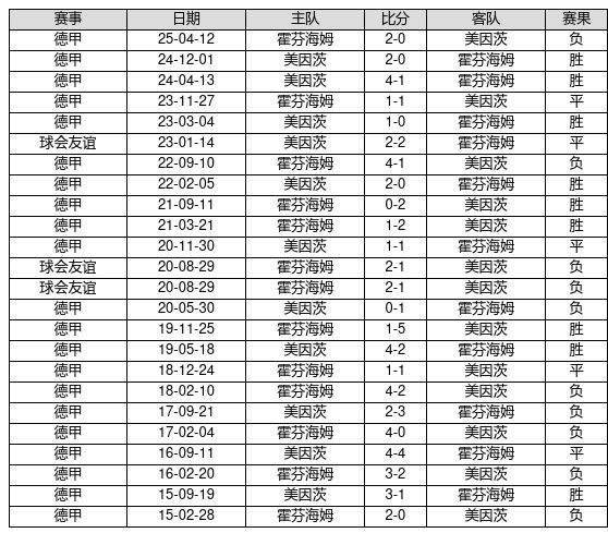 美因茨 VS 霍芬海姆两队近10年的交战次数为24场,美因茨9胜5平10负,赢球概率为37.5%,平局概率为20.8%,输球概率为41.7%。