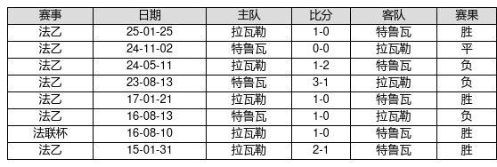 拉瓦勒 VS 特鲁瓦两队近10年的交战次数为8场,拉瓦勒4胜1平3负,赢球概率为50.0%,平局概率为12.5%,输球概率为37.5%。