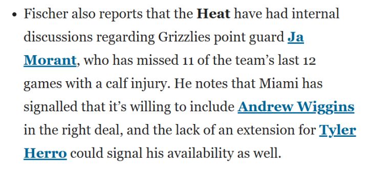 除了是字母哥的潜在下家,Fischer爆料称,热火内部已就灰熊后卫莫兰特展开讨论,后者因小腿伤势已缺席球队近12场比赛中的11场。Fischer指出,热火方面已释放信号,愿意将维金斯纳入合适的交易方案,而希罗至今未完成续约这一情况,也可能意味着他已被球队列入可交易名单。