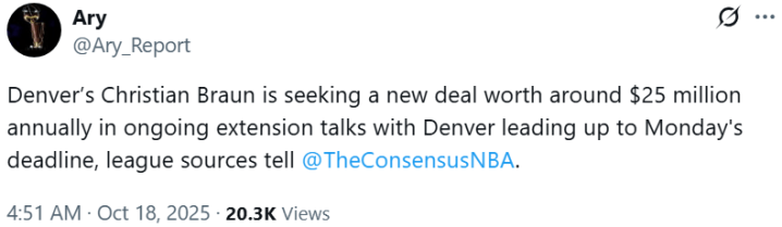 虎扑10月18日讯据记者Ary报道,@TheConsensus消息人士透露,在截止日期为周一的续约谈判中(2022年首轮秀的续约截止日期为本月20号),掘金球员克里斯蒂安-布劳恩正在寻求一份年薪2500万美元左右的新合同。