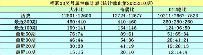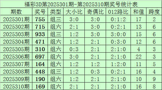 开奖回顾:福彩3D第2025310期奖号为169,其中奖号大小比为2:1,奇偶比为2:1,012路比为2:1:0,和值为16,跨度为8。